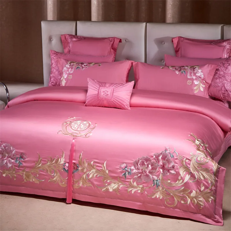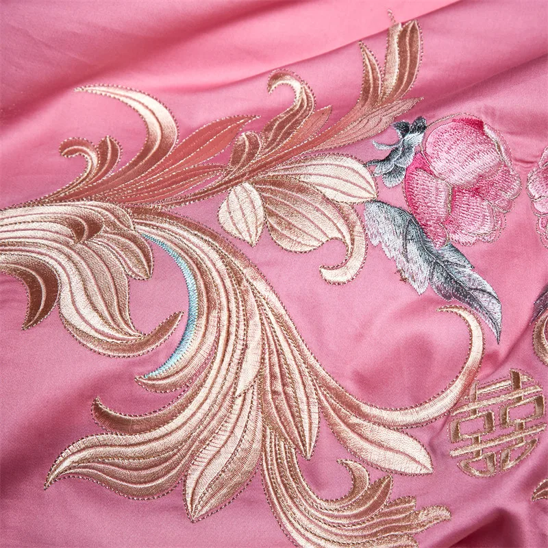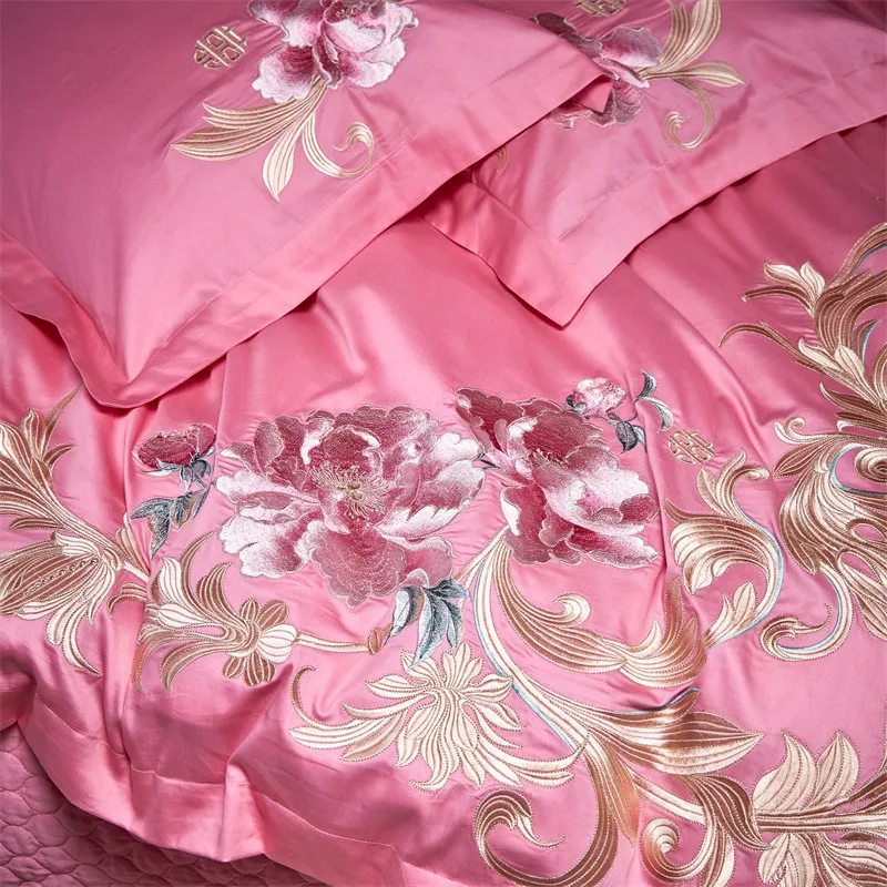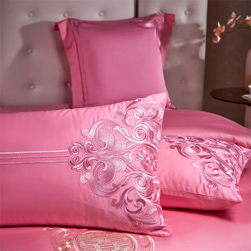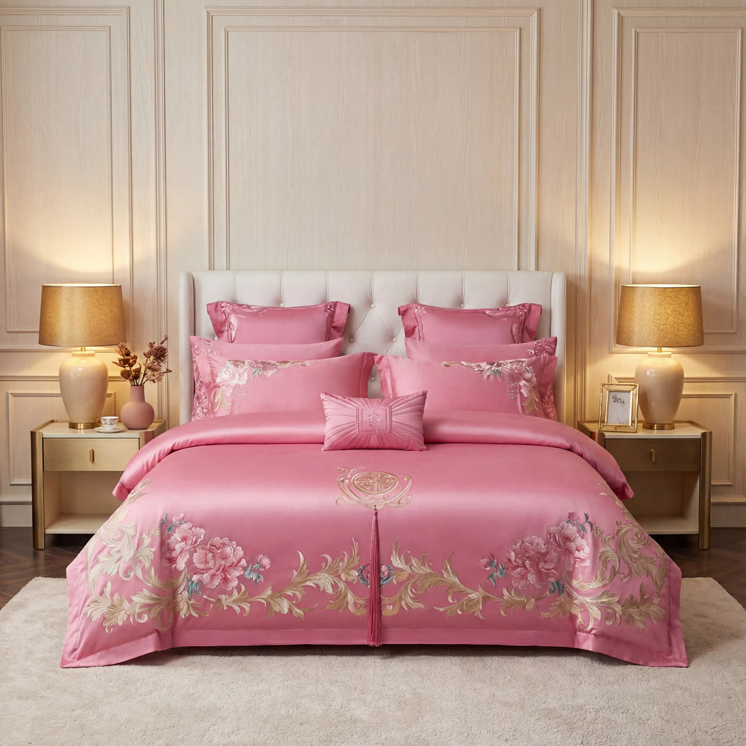 This refined set pairs a vivid pink base with embroidered florals and a smooth satin-like sheen. Crafted from 100% Egyptian Cotton with a jacquard finish for a soft, luxurious feel.