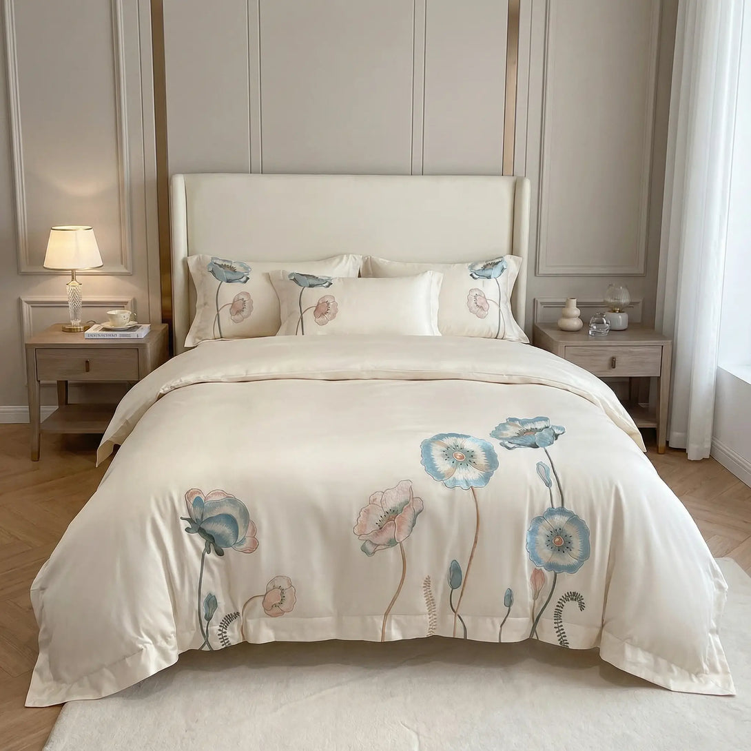 Diese wunderschöne Bettwäsche verleiht der Einrichtung Ihres Schlafzimmers mühelos einen Hauch von zurückhaltendem Luxus, dank der luxuriösen, sorgfältig bestickten Blumen auf einer herrlichen cremeweißen Basis, die Ihre Träume auf die nächste Ebene hebt.