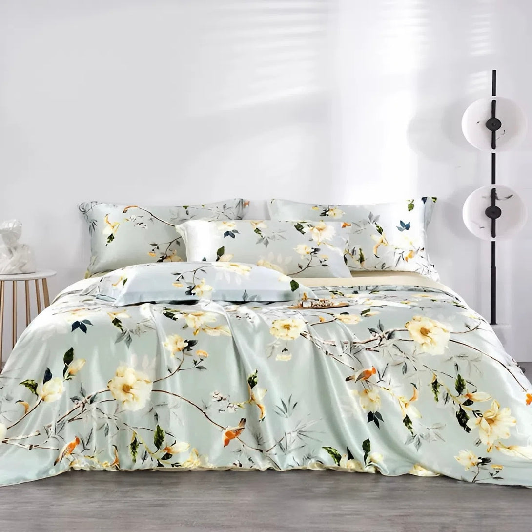 Este elegante conjunto presenta un fondo suave en tonos pastel adornado con delicadas ramas florales y pequeños pájaros, creando un aspecto sereno y refrescante para tu dormitorio.