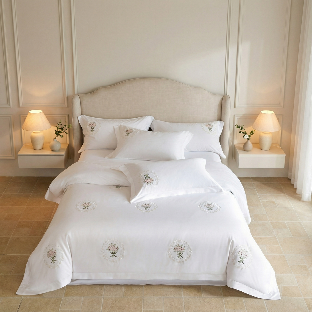 Este conjunto refinado combina un blanco nítido con un intrincado bordado floral. Elaborado con 1000TC 100% algodón egipcio para una sensación suave, fresca y una comodidad duradera.