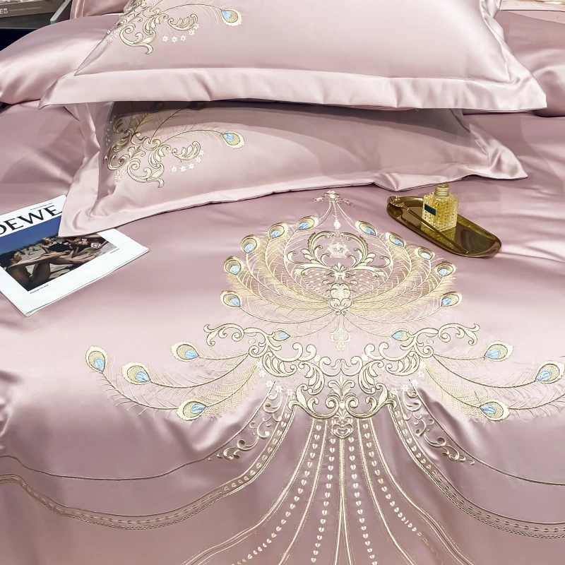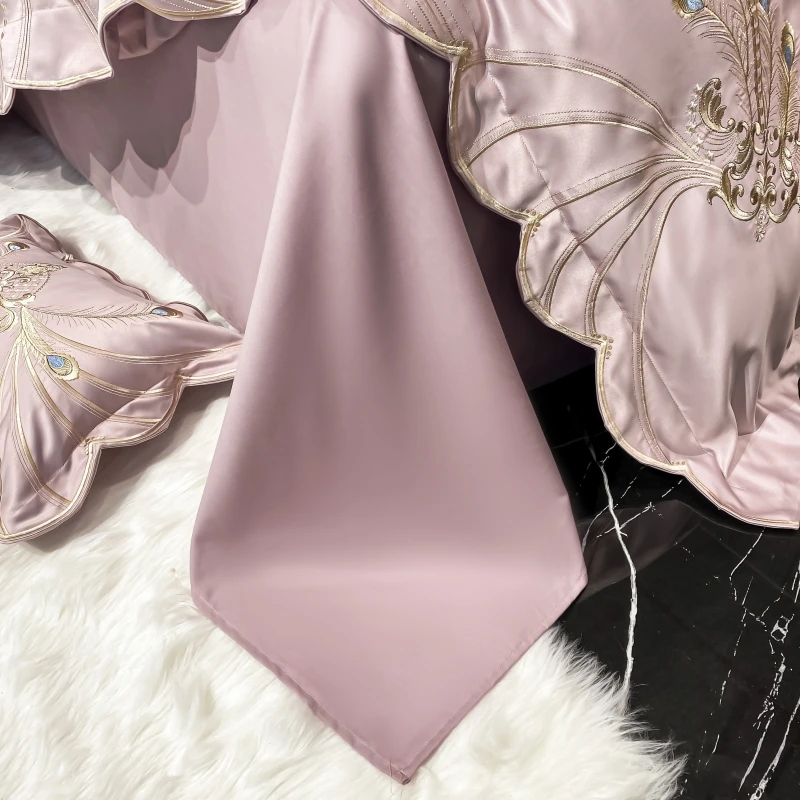 Este set combina el transpirable Algodón Egipcio con un acabado lustroso de Satinado. La base de algodón ofrece suavidad y comodidad, mientras que la parte superior de satén añade un brillo suave. La sábana es de color rosa, hecha de 100% Algodón Egipcio. El bordado presenta motivos inspirados en el barroco con hilo dorado y sutiles acentos de joyas.