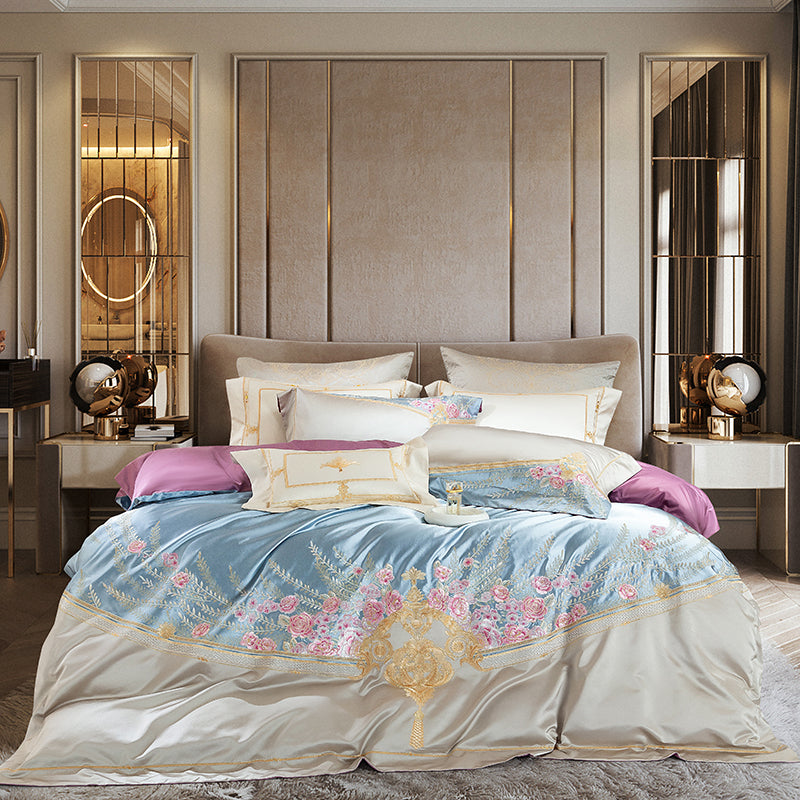 Ivory base, a powder-blue panel, floral embroidery, and gold baroque accents. Crafted from 800TC 100% Egyptian Cotton with a smooth satin-jacquard finish.
